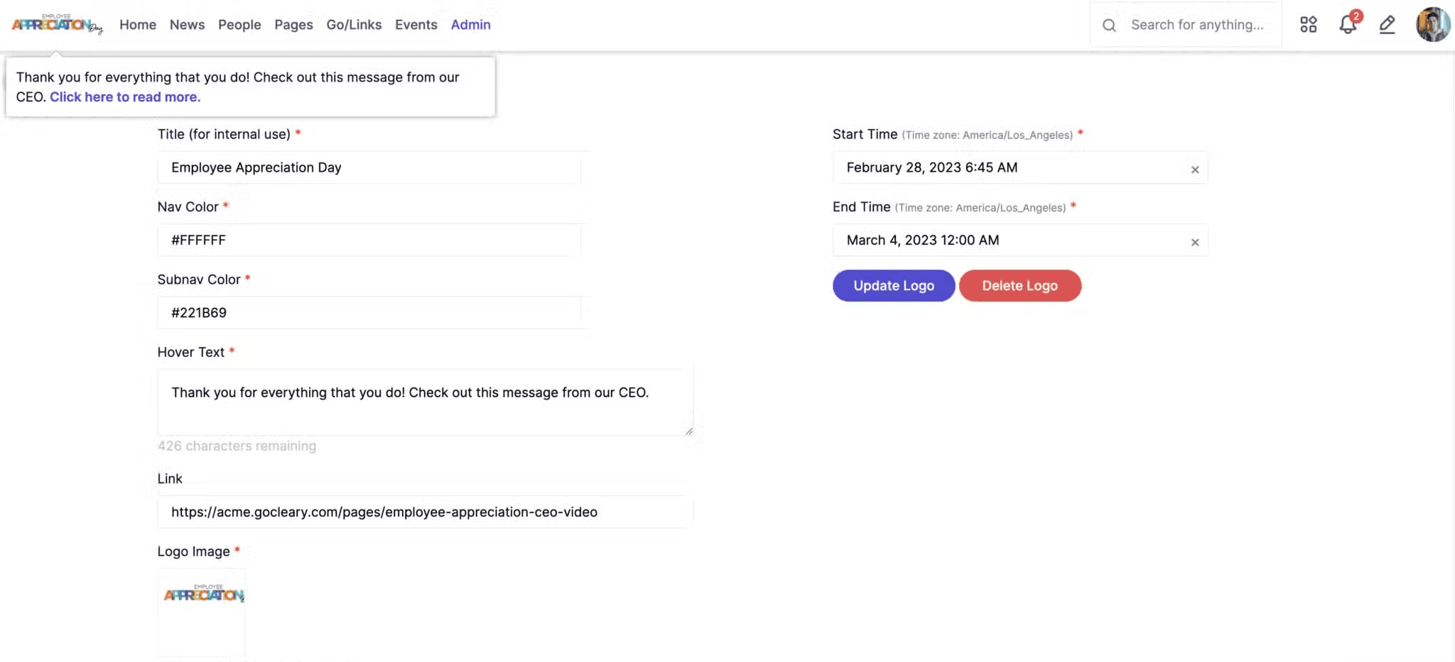 Create a custom logo to display on your homepage to send some love your employee’s way. Much like a Google Doodle – the change in design will make it stand out and bring attention to your gratitude.