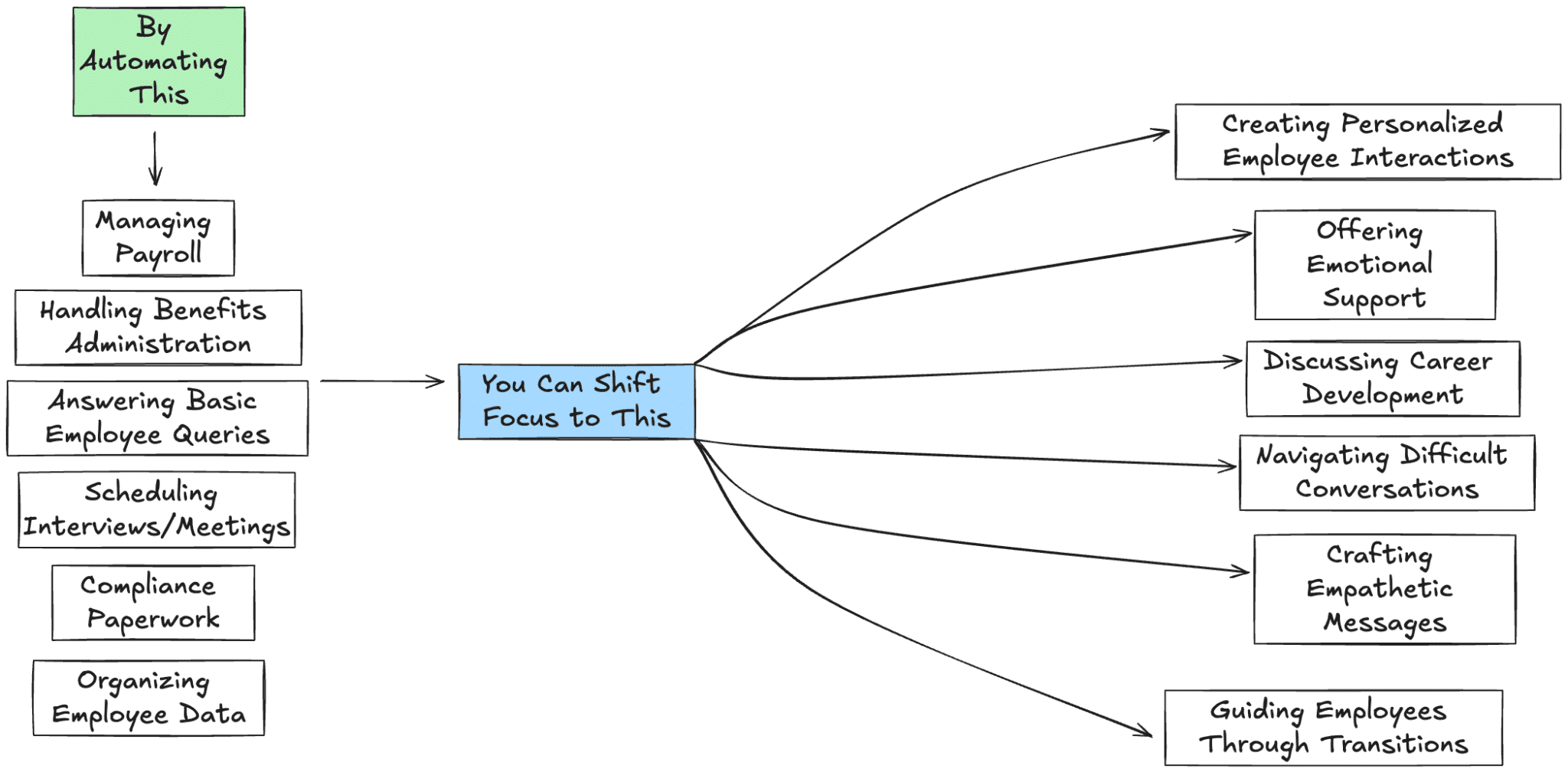 HR professionals can spend a large portion of their time on administrative tasks—handling payroll, managing benefits, answering basic employee queries—that don’t require human intuition or empathy. By automating these tasks, AI frees up HR teams to focus on what really matters: creating personalized and meaningful interactions with employees.